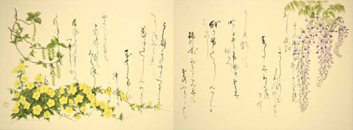 | 元本連盟会長であり本年度より特別顧問に就任した小野清子氏が理事長を務める笹川スポーツ財団にこのたび阿部朱昂本連盟理事長が作品を寄贈した。 本年七月に東京芸術劇場において開催された「二〇一六年國際書画選抜展」に出品された阿部朱昂理事長が万葉集を書し、高橋京子花の絵美術館館長が花の絵を散らしたコラボレーション作品。九月七日東京・赤坂の笹川スポーツ財団に収められた。 |