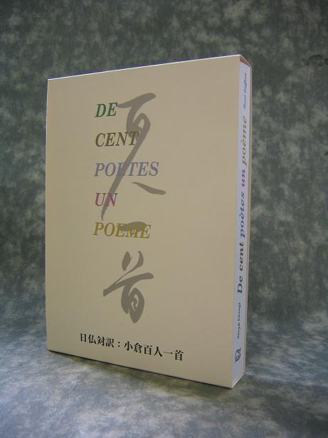 見開き右頁に百人一首を題材とした漢字二字作品、左頁にルネ・シフェールによる仏訳歌、解説が入る上杉蒼龍、ルネ・シフェール共著による「仏訳百人一首」がフランス・POF出版社より発刊された。 ルネ・シフェールによる仏語解説員には右頁書作品の着想、表題解意なども仏訳されて掲載される。A5判、224頁、日本人読者の為には日本語訳サブテキストも付いて定価5,250円。 申し込み先 東京都多摩市一の宮2-24-29 上杉方 百人一首発行連絡所 042-371-2188 |