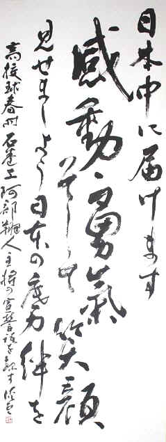 本年度の「春の全国高校野球大会」開会式において行われた石巻工業高校の阿部翔人主将による選手宣誓はまだ記憶に新しいが、神野溪雲副理事長は本年度の「國際書画選抜展」の作品内容をこの選手宣誓文とすることを決め、石巻工業高校の了解を取った。 また、フランス・ナンシー市において開催される「海外巡回展」の都合にて軸装に表具されている聯落サイズ作品は日本に戻ってきたのち、9月24日石巻工業高校へ寄贈された。 |